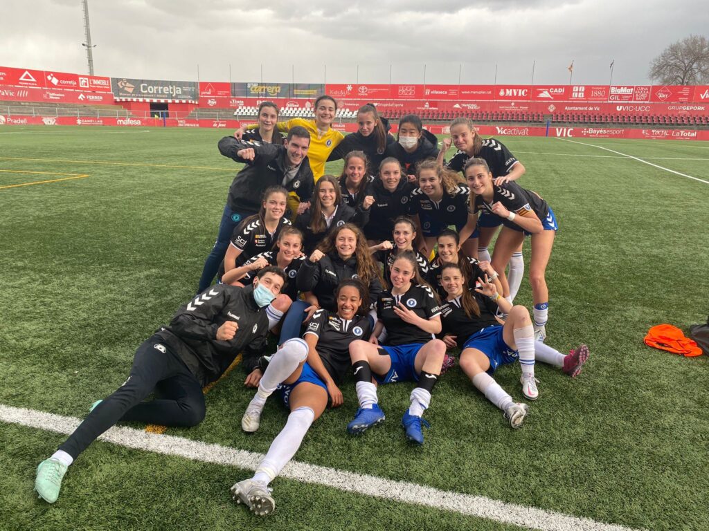 Partido muy disputado ante un conjunto que intenta jugar el balón con buen criterio en todo momento. Primera parte reñida con ocasiones para los dos equipos en la que nos adelantamos con gol de falta directa de Sara Balma en el 40′. Falta provocada por Elena Valej que roba balón a la central, marchándose sola hacia portería y la jugada acaba con la central del Vic expulsada.