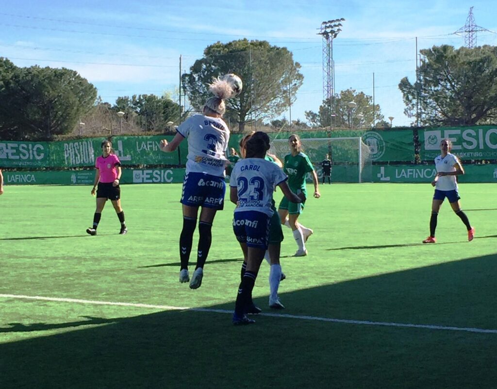 Pese al marcador adverso, las aragonesas no bajaron el pistón. Annelie no llegó por poco a una dejada de Cara Curtin en el área, Laura probó fortuna desde lejos, Mady Brown remató fuera un córner libre de marca desde el punto de penalti y ni Cara Curtin ni Annelie lograron anotar tras una pelea de balón de Nachula con la portera Aurora. En el tramo final del primer acto siguió el dominio visitante, pero sin la precisión necesaria para inquietar la meta madrileña.