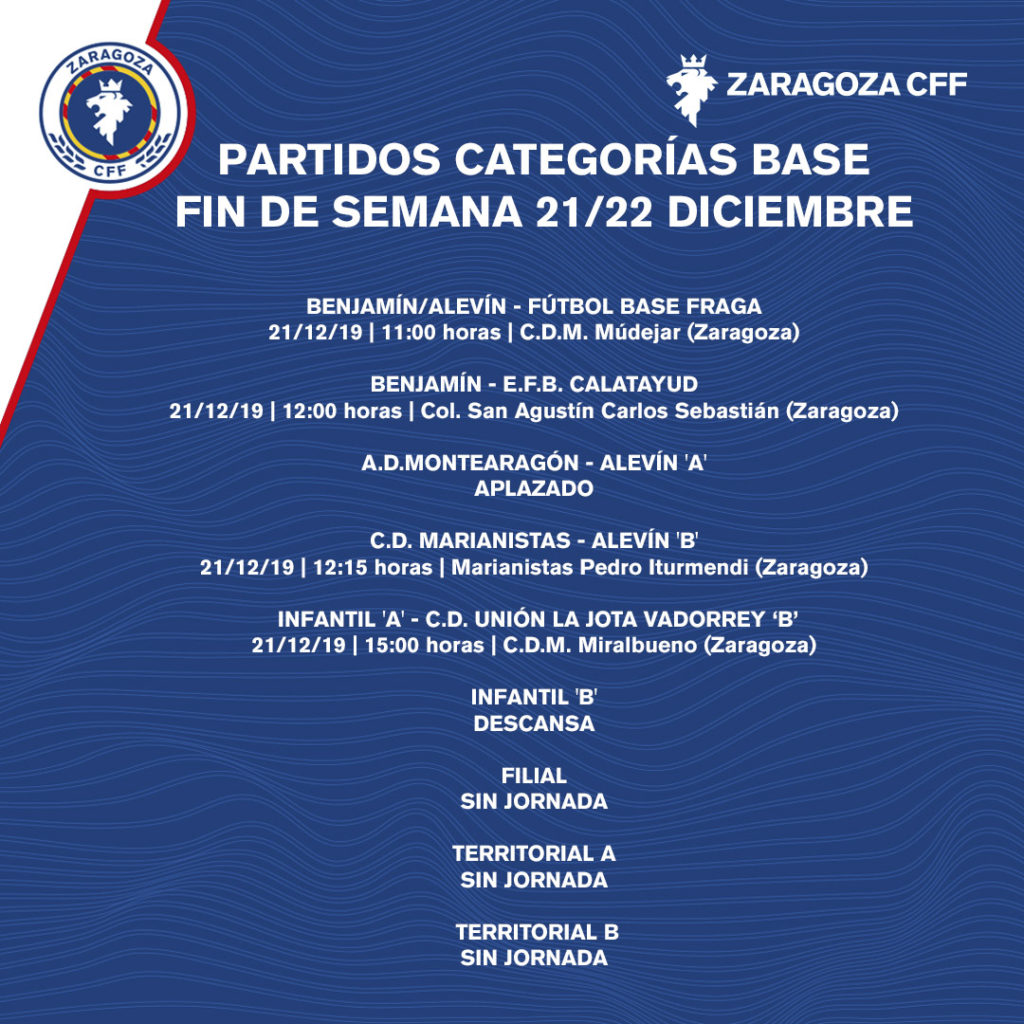 Horarios 21/22 de diciembre ZaragozaCFF hace 6 años Os dejamos los horarios de la última jornada del año de nuestra cantera. ¡Mucha suerte!