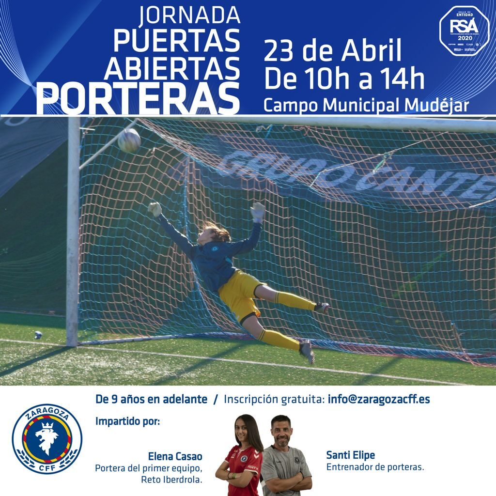 El Zaragoza CFF también organiza una jornada de puertas abiertas para porteras, que se va a desarrollar a la vez y de forma paralela a la ya planteada para jugadoras. Se celebrará el próximo viernes 23 de abril, festividad de San Jorge, de 10 a 14 horas en el CDM Mudéjar y está destinada a niñas de 9 años en adelante.
