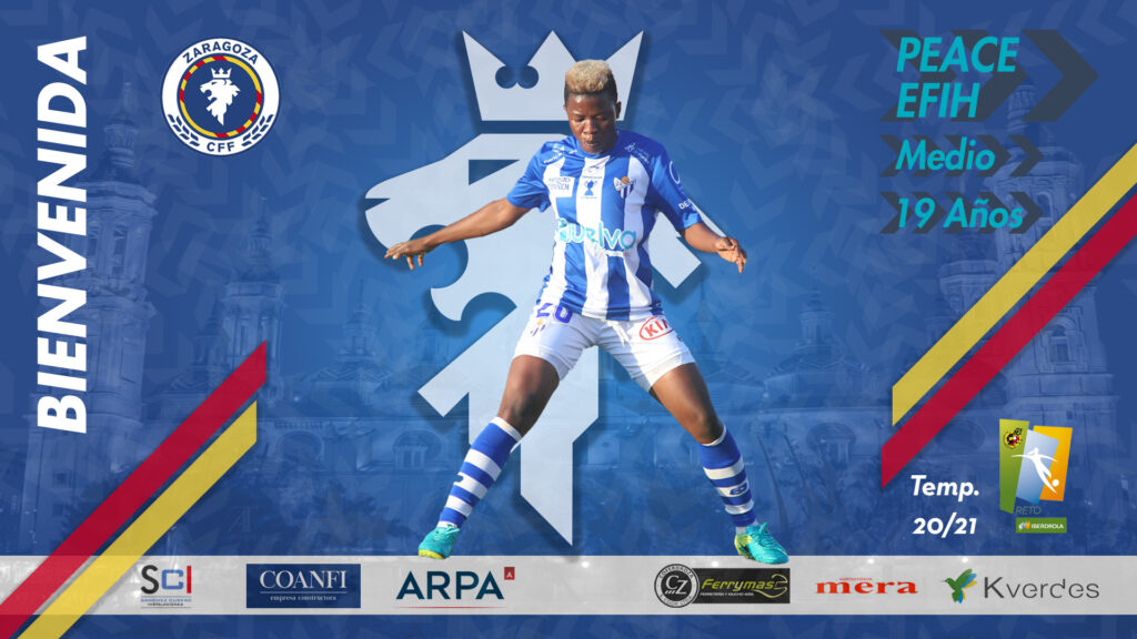 La joven futbolista africana, Peace, llega procedente del Sporting de Huelva, Liga Iberdrola, se convierte en el nuevo refuerzo para la medular del conjunto aragonés, de cara a la próxima temporada 2020-21.