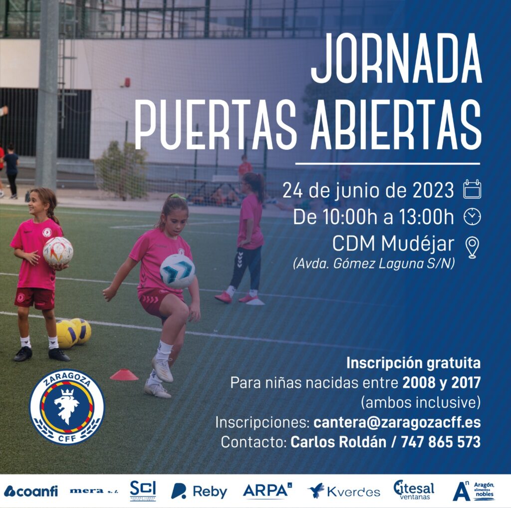 El próximo sábado 24 de junio celebraremos una nueva jornada de puertas abiertas en nuestras instalaciones del CDM Mudéjar, situado en Gómez Laguna. La jornada está destinada a niñas nacidas entre los años 2008 y 2017, ambos incluidos. En esta jornada, las niñas y jóvenes que asistan podrán ver cómo son nuestras instalaciones, pasar un día de convivencia y descubrir nuestra metodología de aprendizaje y competición en torno al fútbol femenino.